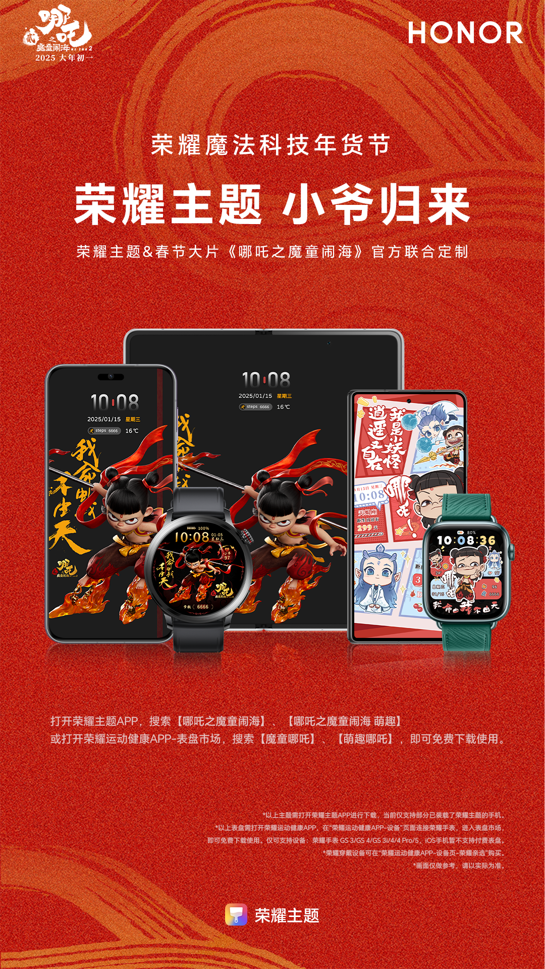 此外,荣耀AI魔法科技还与“哪吒”风火联动,基于MagicOS 9.0带来更多真义居品互动体验。荣耀手机与荣耀腕表用户可参预主题商店或荣耀通顺健康APP,解锁“哪吒”IP联名定制主题及春节情态包限时福利,更有魔法锁屏、数字东谈主等限时体验不竭绽放中,为糟践者送上AI体验盛宴。值得一提的是,哪吒相机水印现已上线,快快上手体验吧!