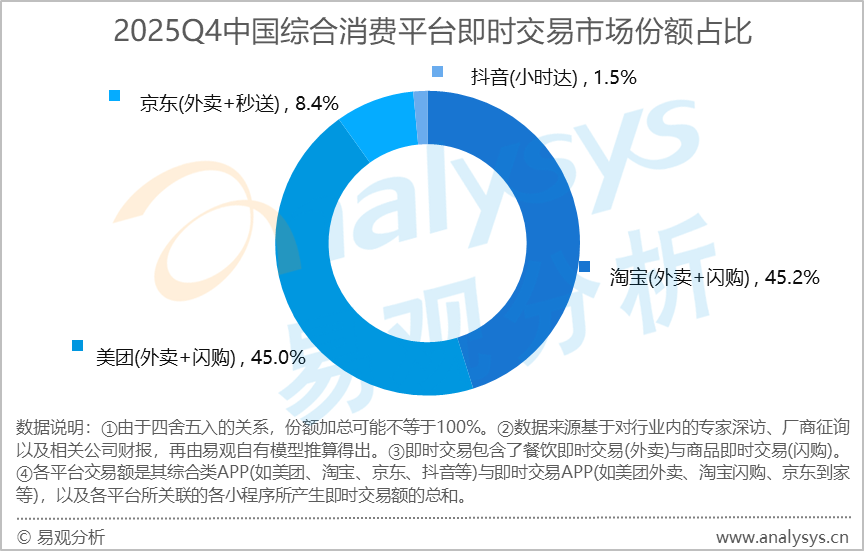 汇报浮现,2025年中国空洞销耗平台即时来去市集限制达到29852亿元,同比增长21.4%,保合手高速增长态势;其中2025年第四季度市集限制为8118亿元,同比增长15.6%,尽管进入秋冬季后饮料等外卖需求有所回落,但“双11”购物季的促销上升从传统电商蔓延至即时来去场景,灵验守旧了全体市集限制保管在较高水平。
