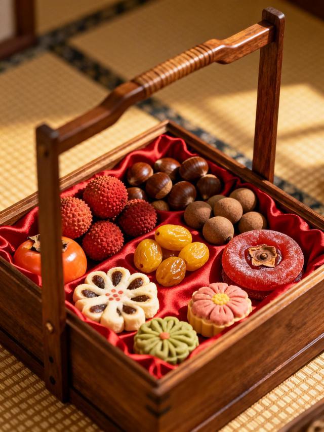 还有一种“百事大吉盒儿”,里头装着柿饼、荔枝、桂圆、栗子、熟枣。同期也会装“嚼鬼”——这名字听上去很怪,其实是切成小块的驴肉,盛在漆盒里。