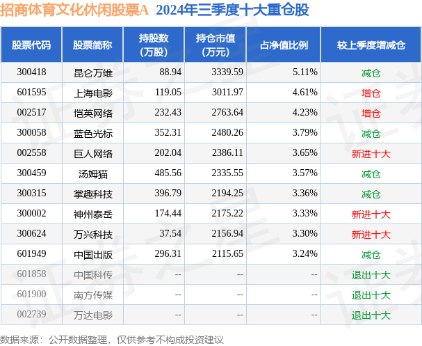 招商体育文化闲适股票A的前十大重仓股如下:开云体育