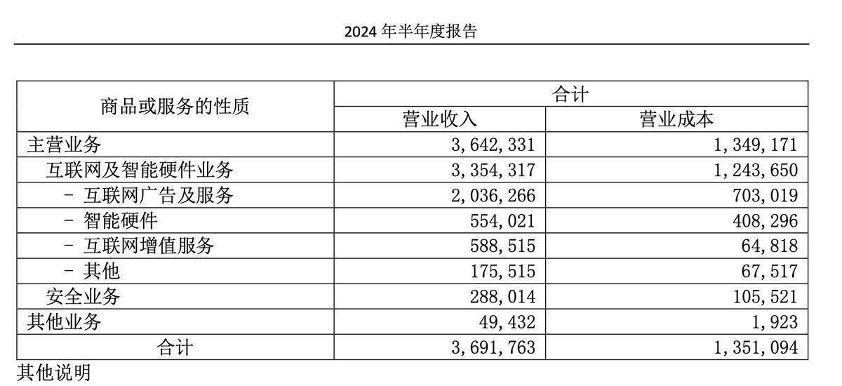 从数据上看,智能硬件和升值管事体量不大,其中占大头的如故互联网告白及管事。字据半年报数据,360互联网告白及管事上半年营收20.95亿,占到上半年总营收的54.7%。