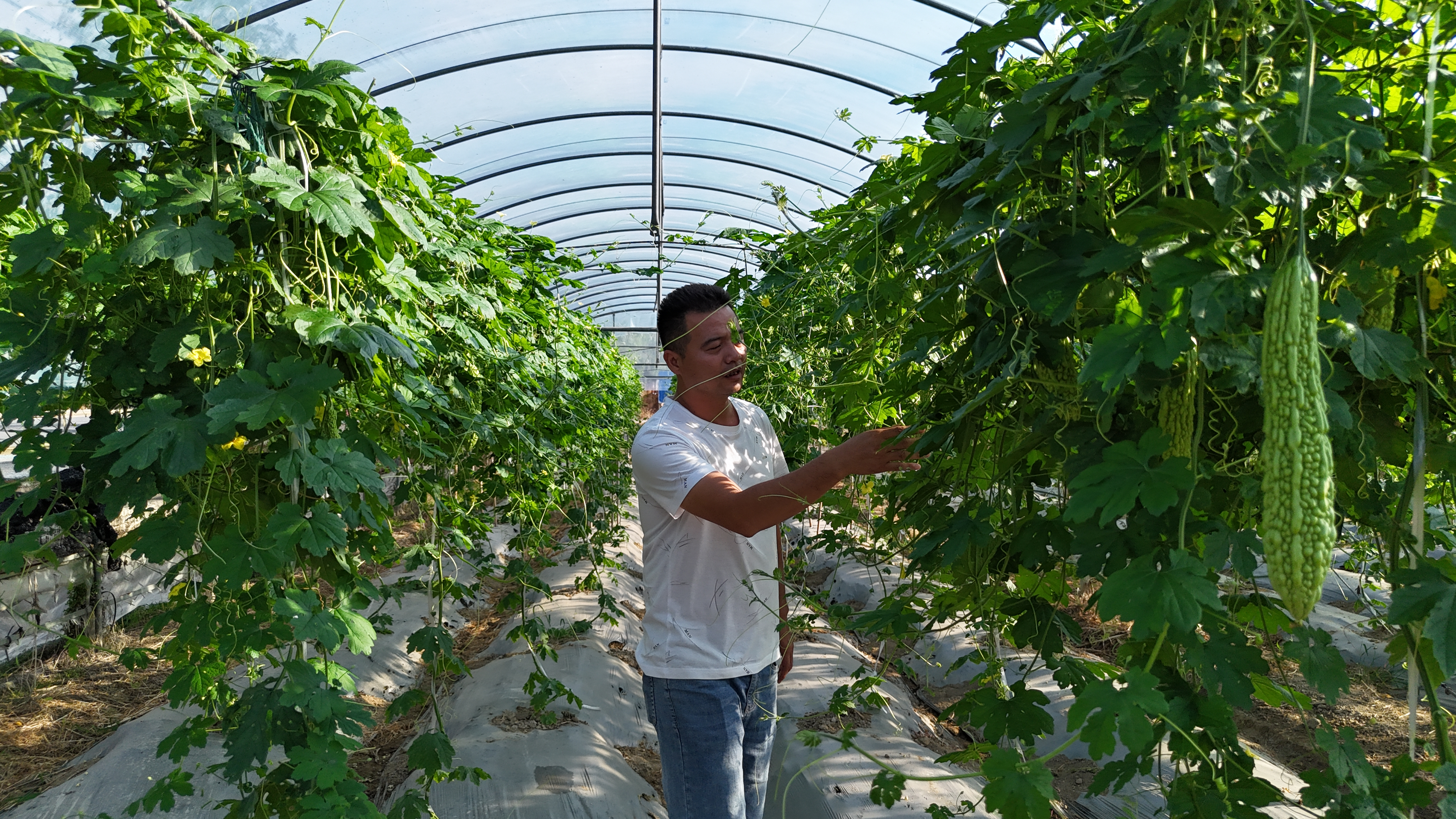 大棚里,苦瓜已暗暗挂果,青翠实足。