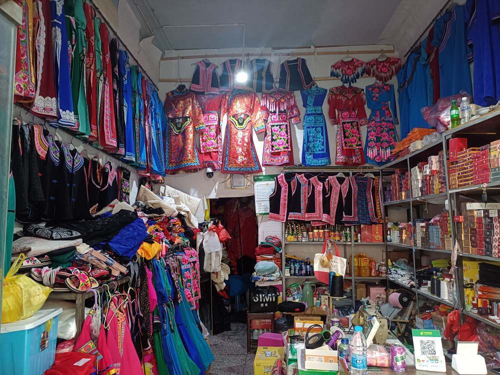赵国芝的店铺里挂满了藏羌衣饰。汶川县香烟公司供图